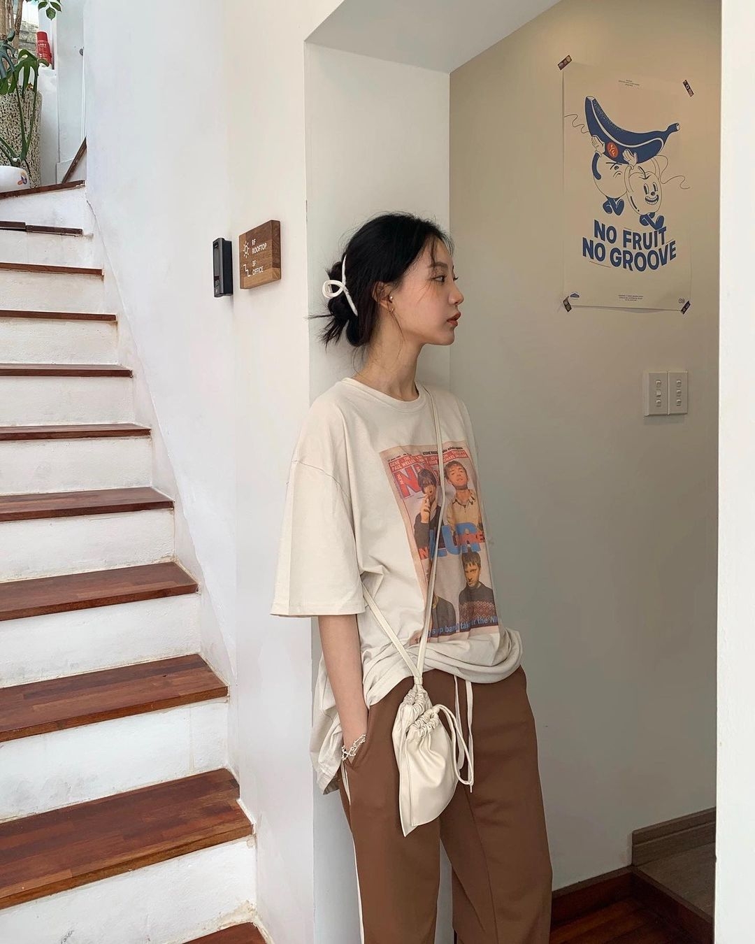 像是短裙襯一對中長靴,馬上提升造型感,變得俐落又有個性!或者以奶茶色調的圖案T恤加上寬褲則會比較中性又休閒~各有特色!