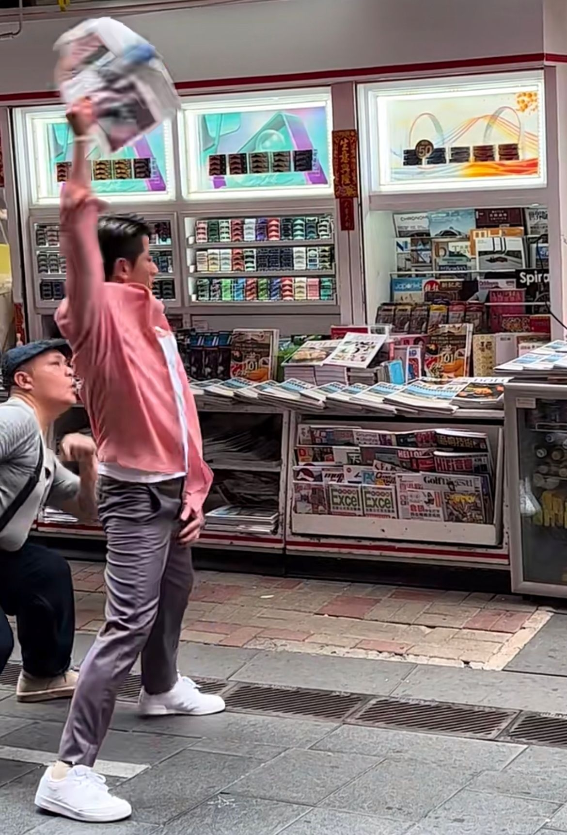 從網民拍攝的畫面中可見,郭富城身穿白色背心配搭粉紅色外套,下身穿上皮褲,站在一間報紙檔買報紙,買完後突然拿著報紙大騷舞技,而身旁的老闆在看見郭富城後,表情非常驚訝,然後兩人更一同跳起舞來,非常搞笑!