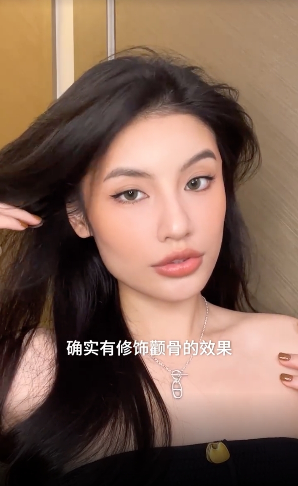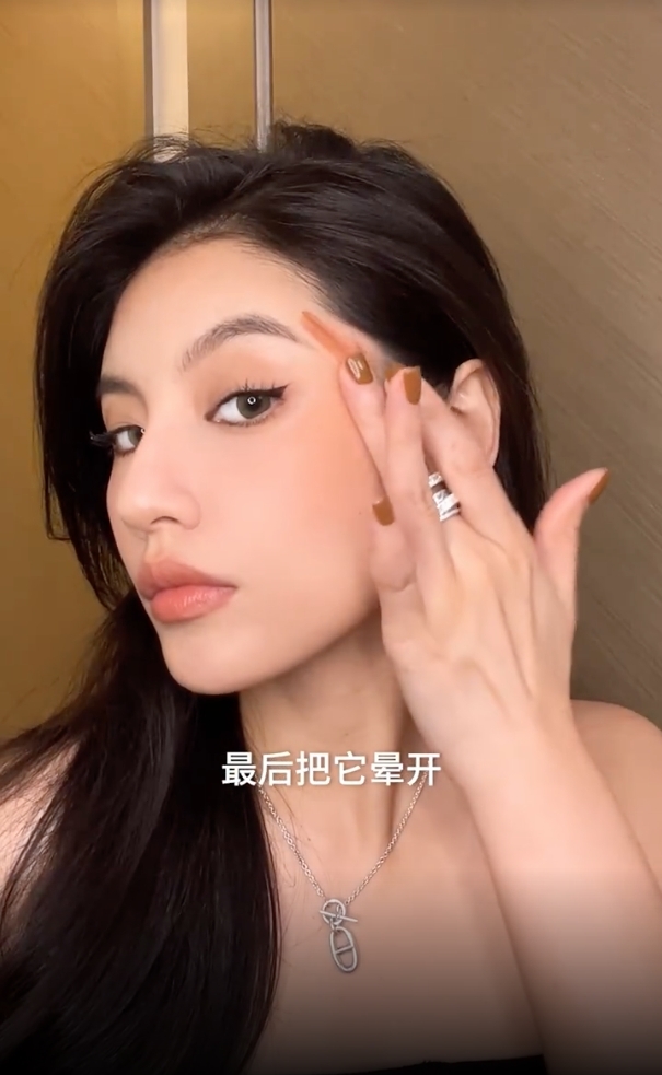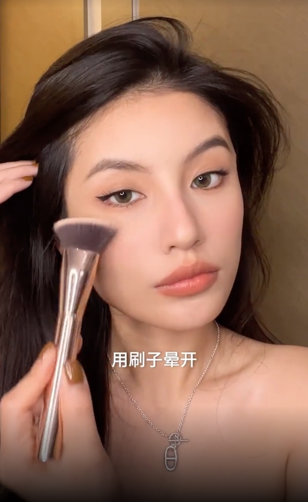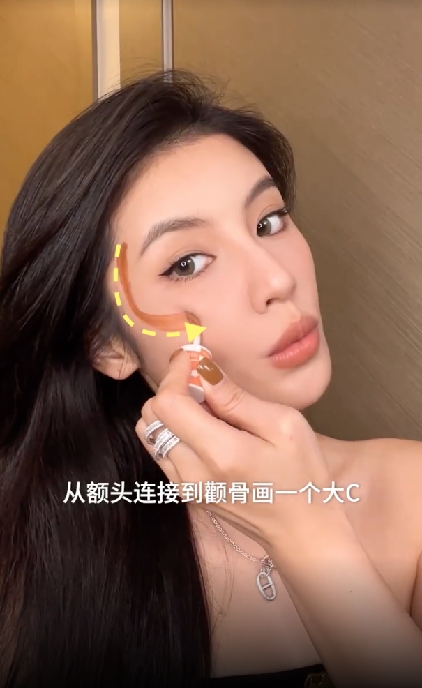 這種畫法會比較接近歐美感的妝容,將胭脂從眉尾位置順著輪廓畫至顴骨位,形成一個大「C字」,再利用胭脂掃或粉撲微微暈開~