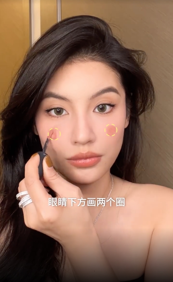 在兩邊臉頰中間、眼睛下方位置畫上圓圈狀的腮紅,再慢慢地向外打圈掃鬆,令圓圈腮紅稍微向外放射地暈開便可以了。這樣臉頰和蘋果肌的位置更顯飽滿,整體散發出一種甜美可愛感~