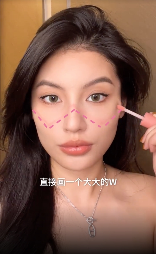 將胭脂從眼尾下方開始,向顴骨和蘋果肌的位置輕掃,再連到鼻樑位置,將臉頰兩側和鼻子中間連接起來,畫成一個「W字」再用胭脂掃或粉撲拍開便完成~若想妝感更完整可以在鼻頭及下巴輕輕地補上胭脂。
