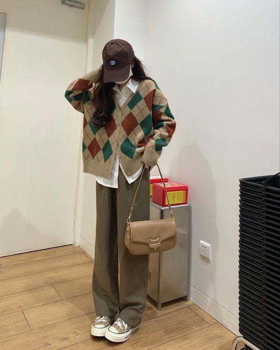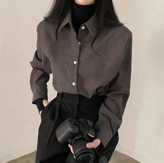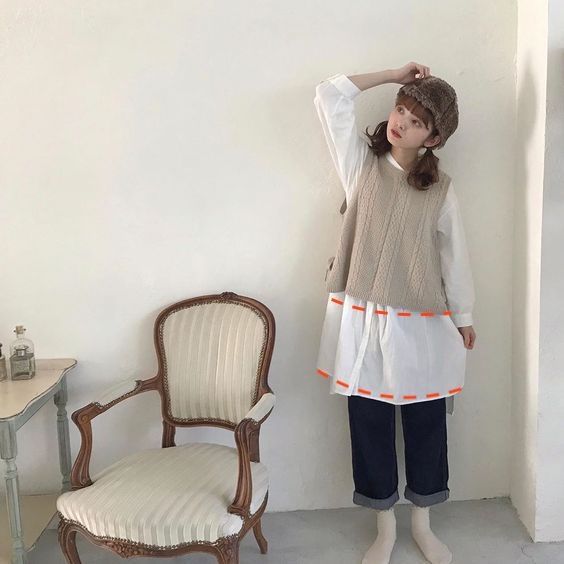 不少韓妹、日本女生都愛內搭一件薄薄的圓領或是小高領內搭再搭配恤衫、V領針織衫,稍稍地露出頸部線條,看起來臉部更修長和顯瘦,造型休閒又有層次感!
