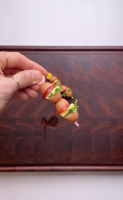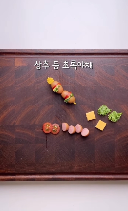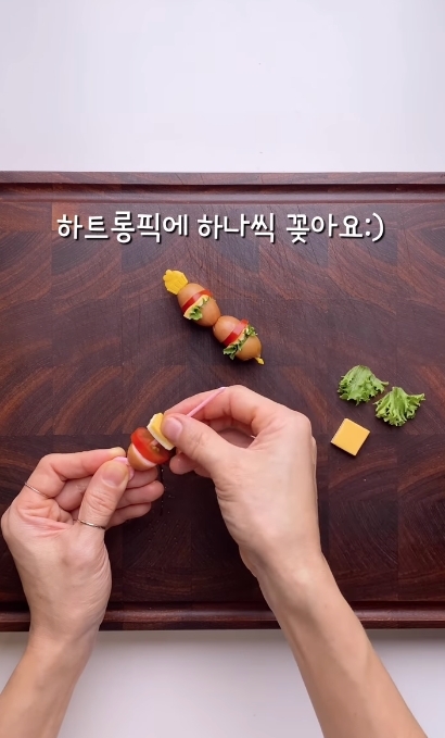 2.先後串上香腸、車厘茄、芝士、生菜,最後串上香腸。迷你漢堡包就完成了。
