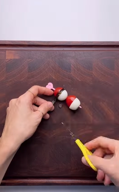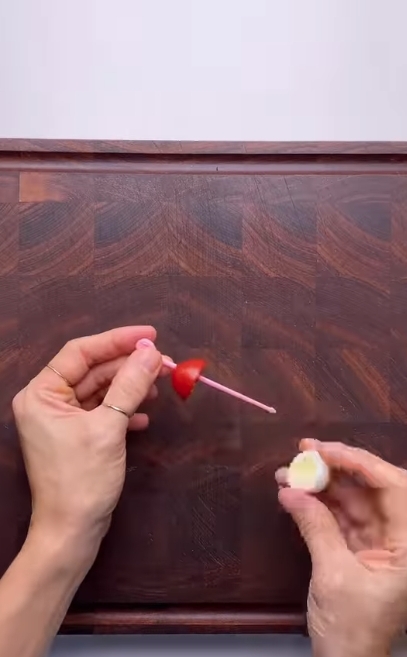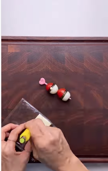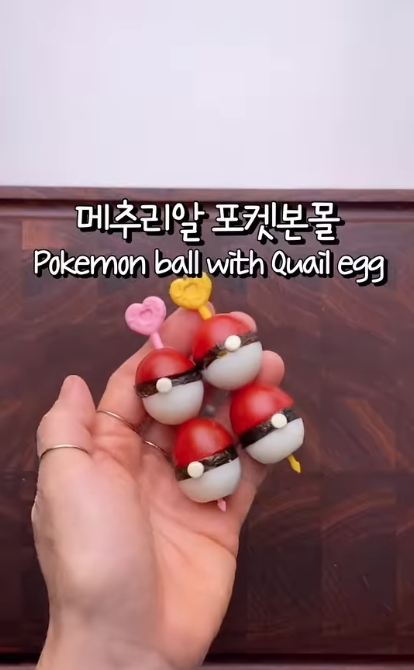 1.把車厘茄和鵪鵪蛋切成一半,然後用膠籤把車厘茄串上,再串上鵪鶉蛋,那就成了精靈球的基本外形。
