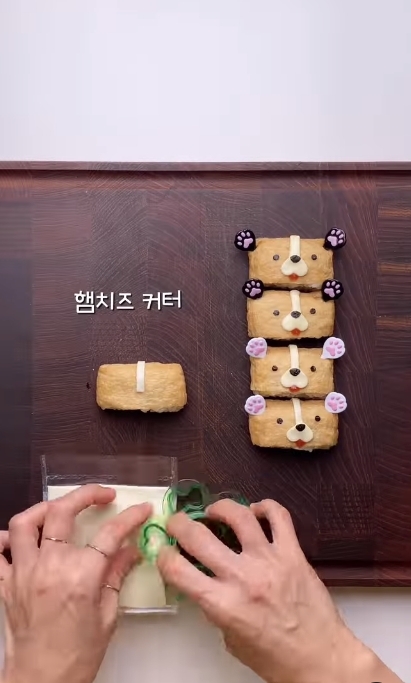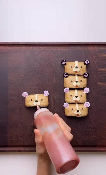 4.最後,插上裝飾用的膠籤,例如狗狗耳朵、狗狗肉掌,再擠上蕃茄醬當作嘴巴。
