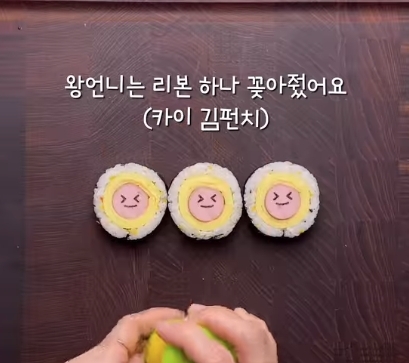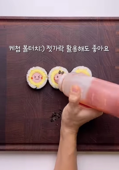 3.最後把壽司切塊,然後裝飾。同樣用印花模具在紫菜壓出眼睛、嘴巴,放上香腸,再擠出兩點蕃茄醬當作腮紅。