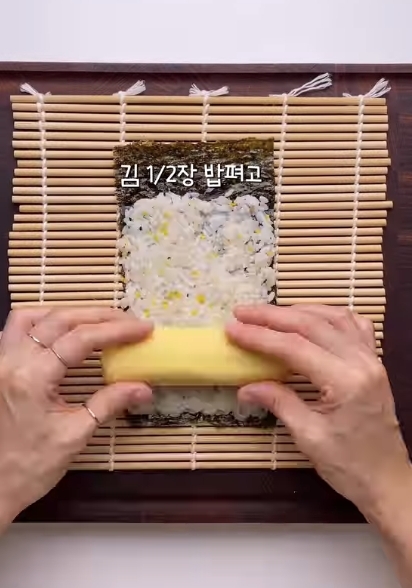2.在紫菜的8成面積,鋪上壽司飯,再卷上香腸卷蛋,並用壽司竹簾捲實。