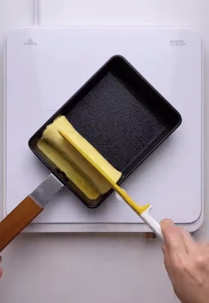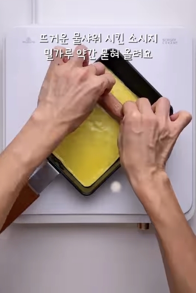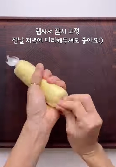 1.在熱鑊倒上蛋漿,差不多熟透後,再放上香腸,慢慢用蛋捲起香腸,再倒入蛋漿,繼續捲以封口。捲好後,用保鮮紙,或者剪成一塊的亁淨塑料袋包好,左右扭緊,好像香腸一樣,令蛋卷更紮實。