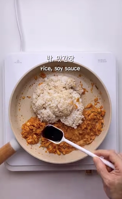 1.先炒切碎了的泡菜,再放入白飯和豉油,想要更多韓風味道,可以加入韓式辣椒醬一起炒。