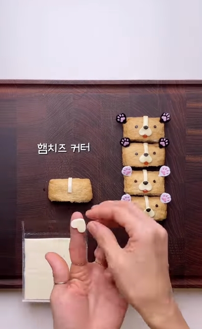 2.在一塊芝士上?出你想要的數量的芝士條,再在剩下的芝士塊用心形印花模,印出心形。把芝士條放腐皮表面,當作鼻樑,再在芝士條末端,放上倒着的心形芝士,好像圖中一樣擺,當作鼻子。
