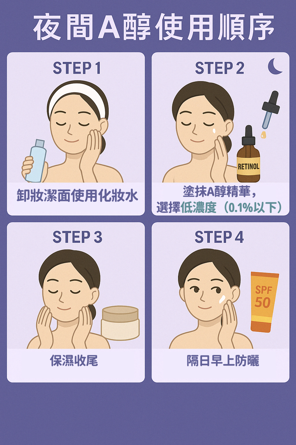 晚上先徹底卸妝清潔,去除彩妝、防曬與髒污。洗臉後同樣以化妝水為肌膚補水,舒緩白天的乾燥,為吸收A醇做好準備。