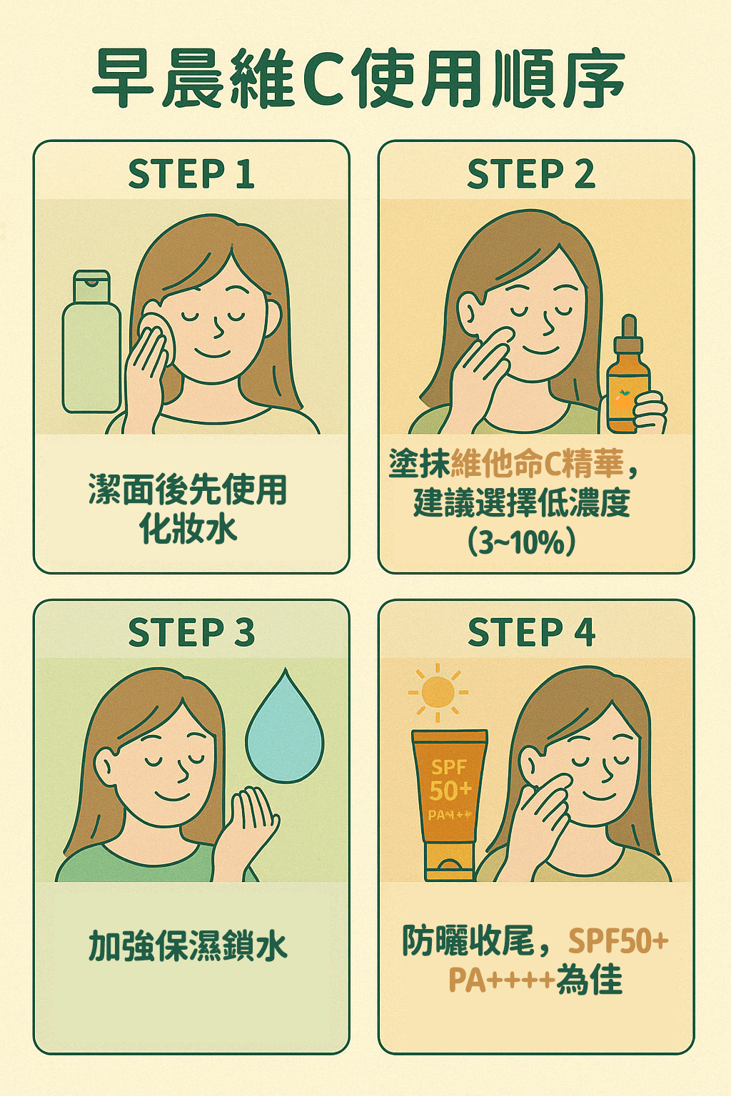 早上清潔臉部後,可先以化妝水或爽膚水濕潤並平衡肌膚,讓後續產品更好吸收。同時這一步提供基礎保濕,減少維他命C直接接觸皮膚可能造成的刺激。