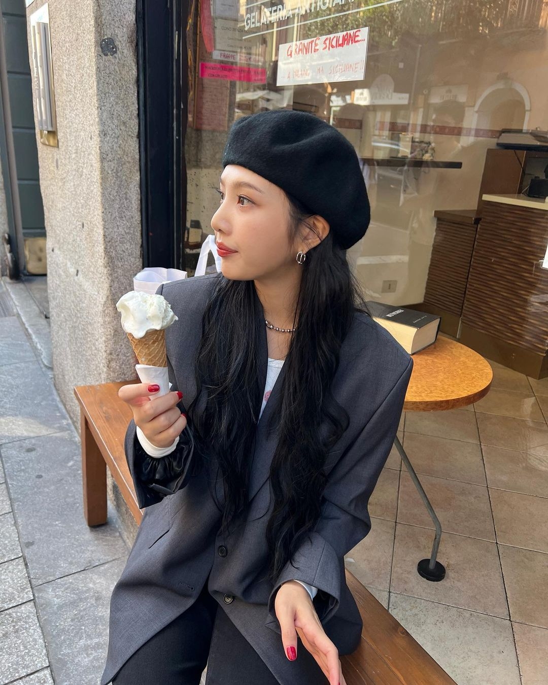 像Joy這樣以簡單的黑色貝雷帽,襯上俐落的黑色西裝外套,馬上增添不少活力感,又不會過於正式的感覺~