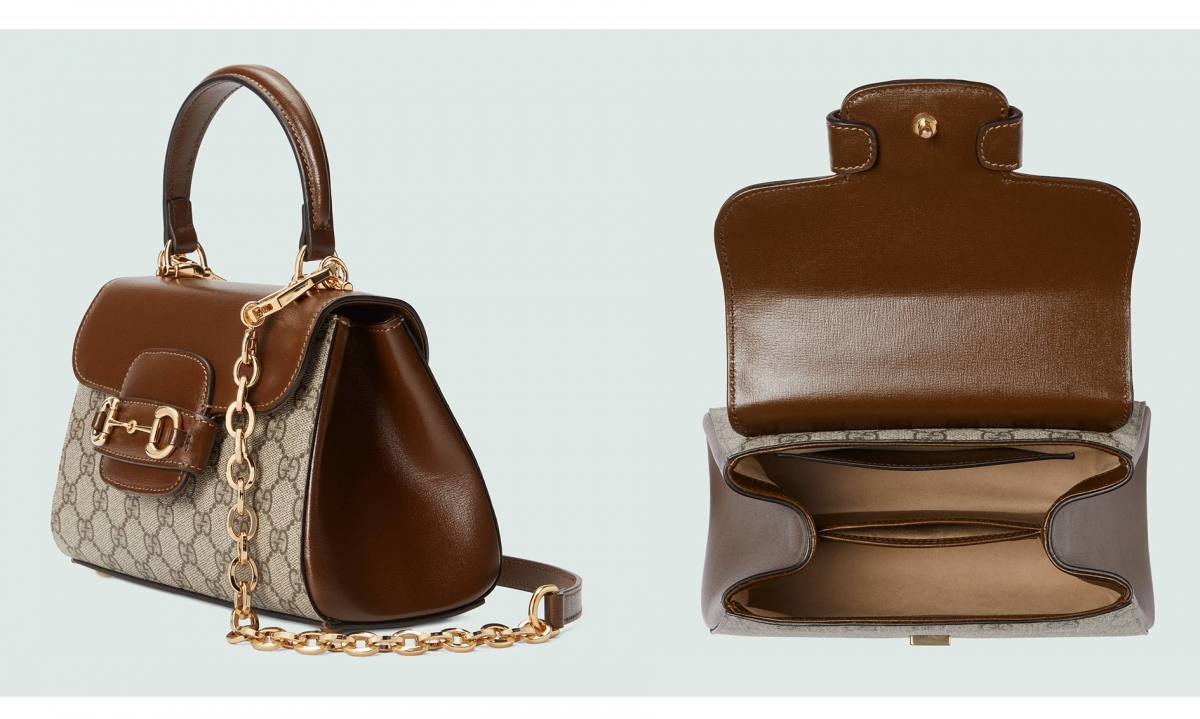 以Gucci經典的金色馬銜扣1955為主,突顯馬銜扣細節,並採用淺棕色皮革製作,再配上一條金色鏈帶及皮革肩帶讓大家自行搭配,十分有質感!加上雙G老花設計,充滿復古感!