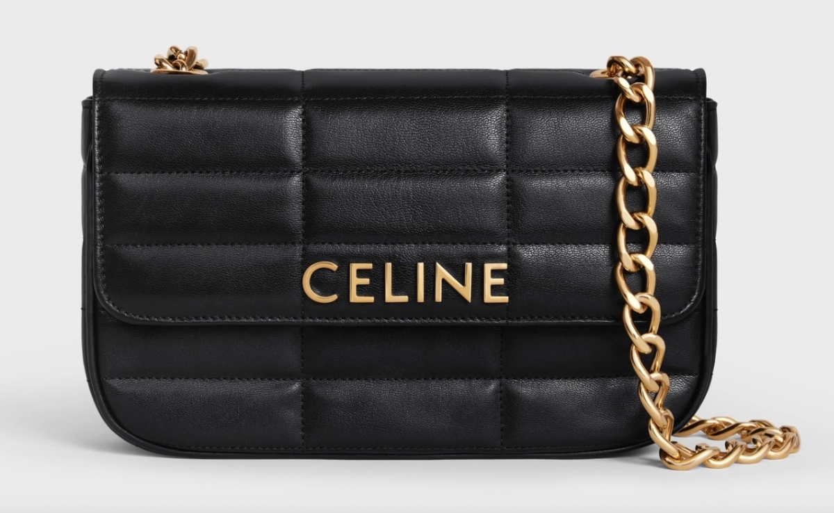 以黝黑色的小羊皮革為主,長方形的外型,搭配絎縫的方格設計,加上金色的 "CELINE" LOGO,整體簡約又百搭!