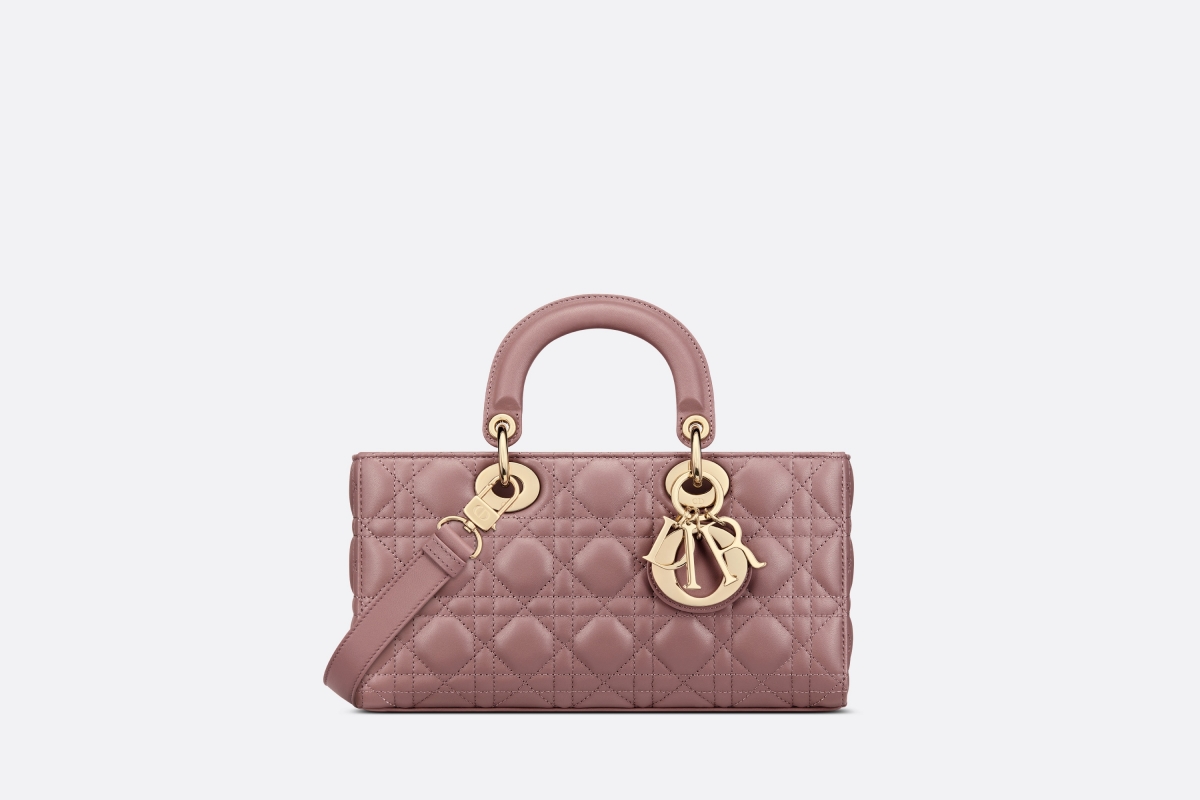 DIOR LADY D-JOY手袋以簡約的長方形包身設計,並使用了牡丹粉紅色羊皮製作,配搭 Cannage 藤格紋圖案縫線,加上手提位置更綴有淡金色色調金屬「D.I.O.R.」吊飾,充滿高貴典雅的感覺。附有可調整和可拆卸的肩帶,不論是手提、肩背或斜背都各有特色,展現出不同的女性魅力!