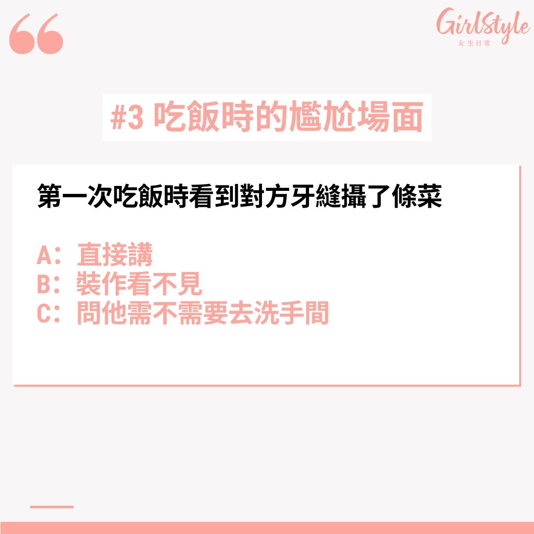 Karis指出男生喜歡相處直接,她認為牙縫攝了菜不算尷尬,她會直接向對方明言,又笑說「如果他有鼻毛我就不會說了,太尷尬,反正我可以注視其他地方哈哈!」