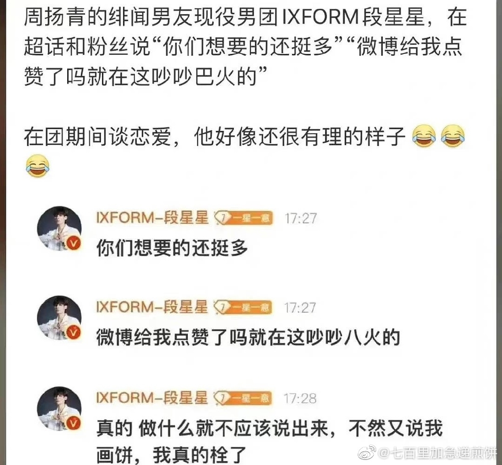 今年24歲的段星星在參加《青春有你3》後以男團形式成功出道。有網民驚覺,周揚青新歡段星星,與舊愛羅志祥的模樣相似,特別是兩人都有很重的黑眼圈。羅志祥當年被爆出黑眼圈很重,可能是因為常常晚上會與不同女生約會,更被笑稱是「時間管理大師」,因此這次也有網友擔心周揚青會否再次受騙。