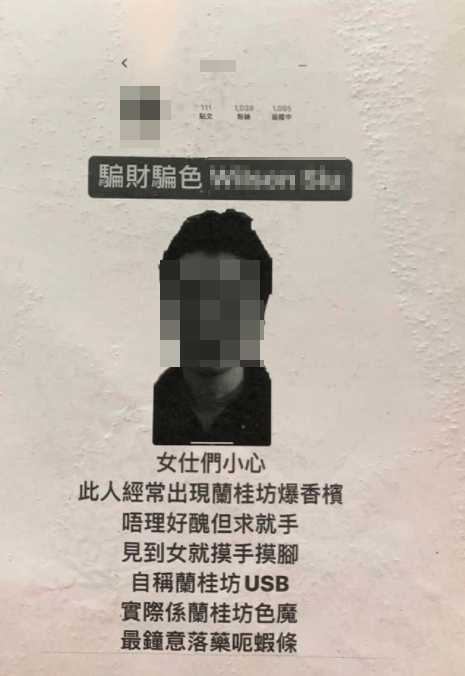 原來除了印有陳雅麗資料的街招外,街上還散落著一位經常在蘭桂坊出沒的男士街招,街招上特意提醒叫女士們小心,指這個人會騙財騙色,而且經常對女士摸手摸腳,不過就未知這位男士與陳雅麗的關係。