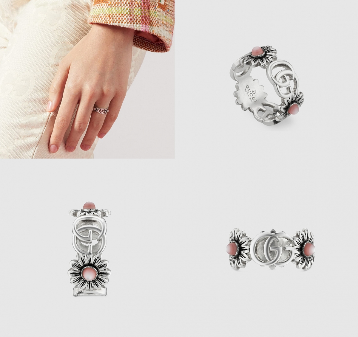 以珍貴的925仿古紋銀製成,將經典雙G Logo與精緻的粉紅色珍珠貝母花卉設計結合,並綴有3顆珍珠,設計低調漂亮,同時不失品牌特色!不少女生也大愛這款戒指!
