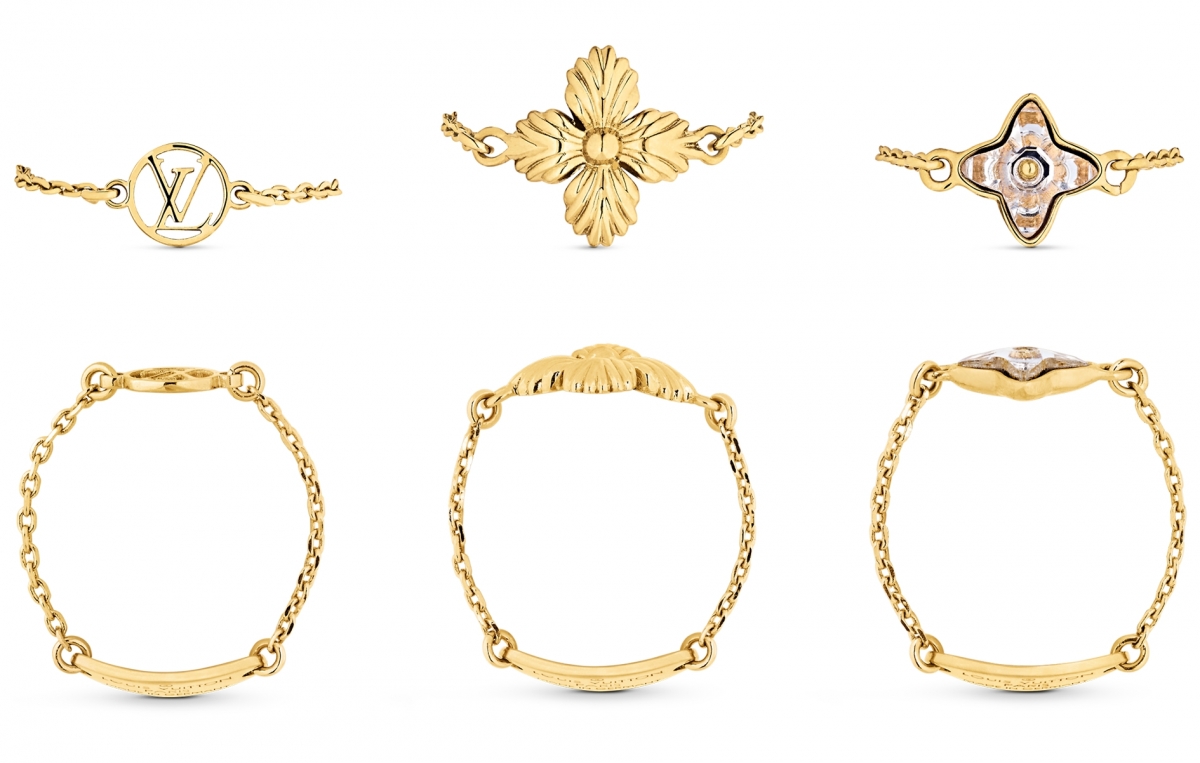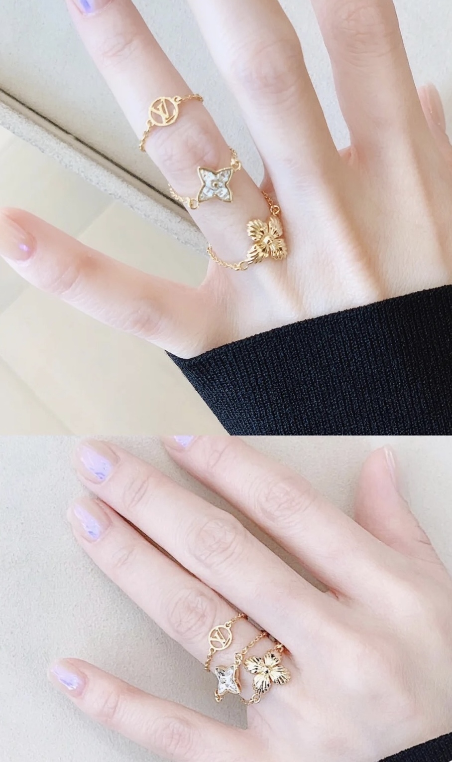 這款Blooming Strass戒指一套有3枚精緻又時尚的金色戒指,以鍊帶形式連接圖案和刻有LV的金色小吊牌,超好看!其中一隻綴有經典LV Circle標誌,另外兩隻分別以水晶及金色金屬的Monogram花卉圖案為主,十分優雅又百搭!不論是疊戴還是單戴都可以,CP值超高!