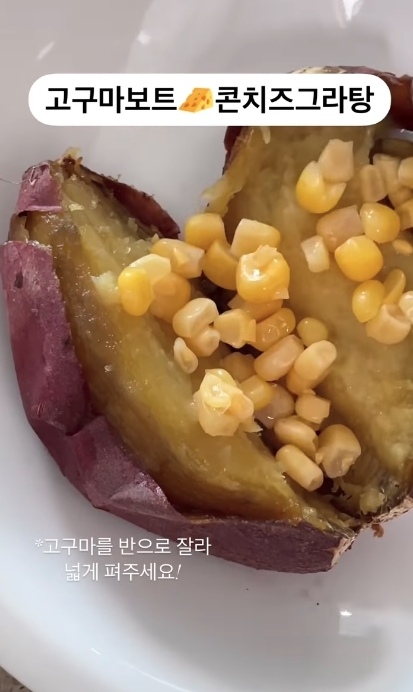 在姜敏京的IG上會看到她經常會分享簡單又好味的減肥食譜,當中有芝士粟米蕃薯,而且材料非常簡單,只需芝士碎、粟米粒及一個蕃薯就可以做到,先將蕃薯切開,再鋪滿粟米粒及撒上芝士碎就可以放進焗爐,而且可以配搭水果及沙律一起吃,將難以入口的蕃薯變成美食!
