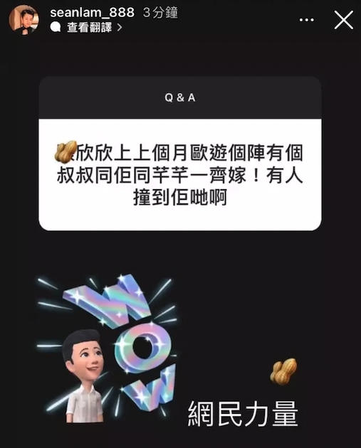 不過在Sean Lam的「你問我答」中,有網民分享她早前曾目擊張欣欣和妹妹張芊芊歐遊旅行時,旁邊有一個「叔叔」同行。而Sean更以「網民的力量」作回應,疑似指這位「叔叔」就是包養張欣欣的有錢人之一!