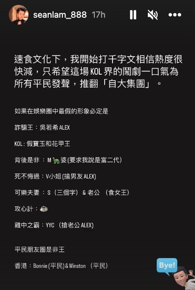 之後Sean又在IG Story一文總結他心目中娛樂圈最假的形象,不過並沒有指名道姓,反而引起大量網民在網上不斷猜測。