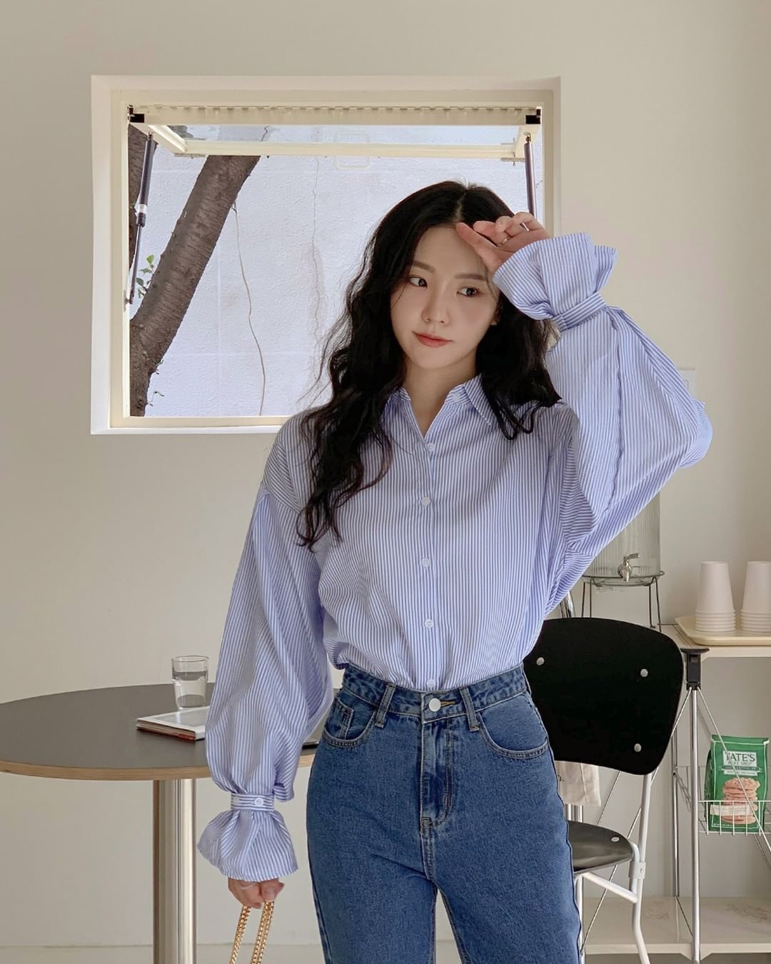 很多日韓妹都愛將間條紋的長袖上衣或小外套搭在肩上,大家都可以參考一下,即刻日韓感爆滿!