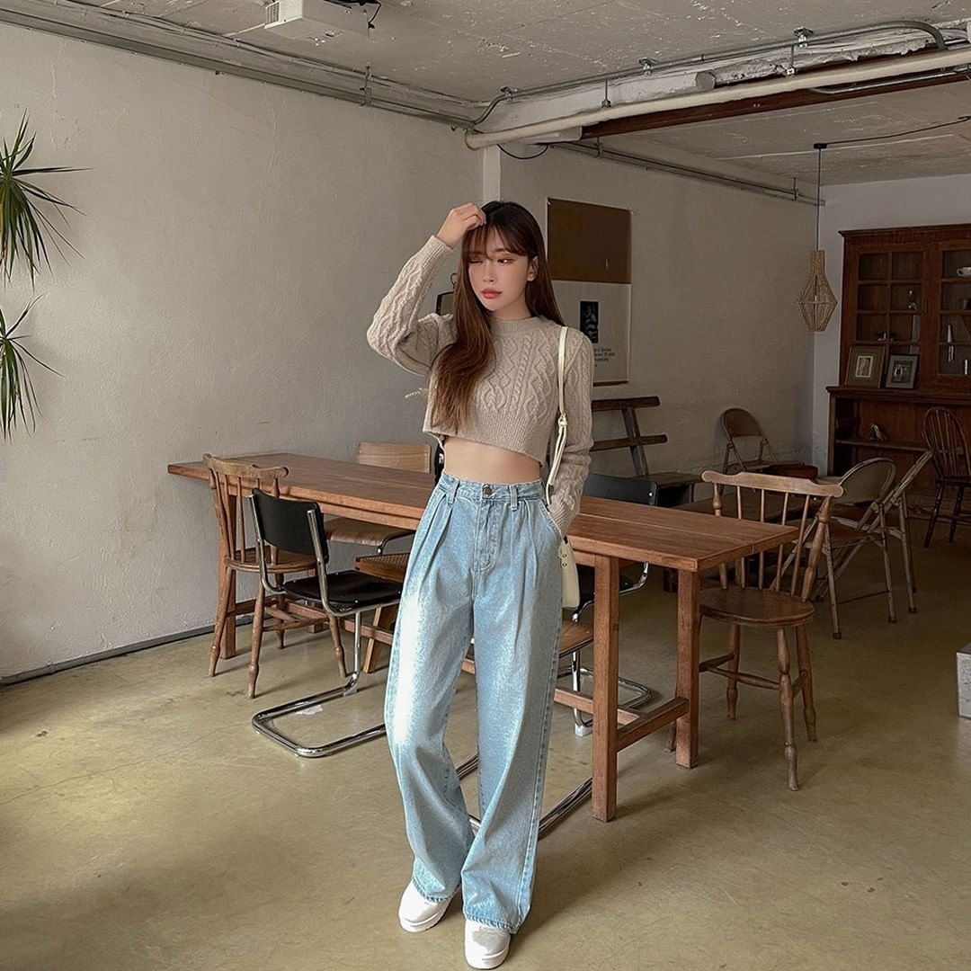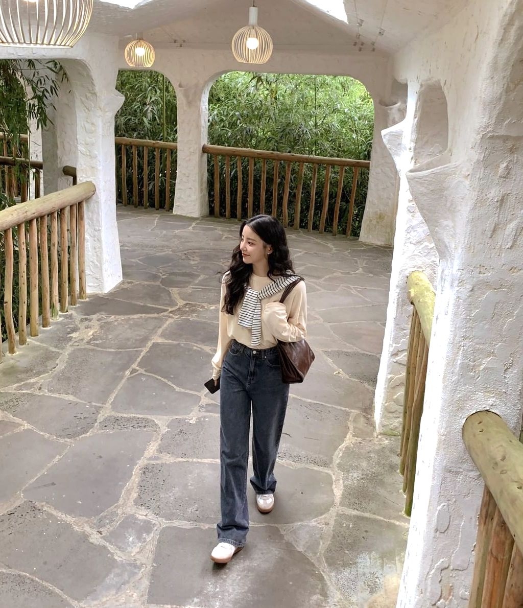 有時煩惱下身該穿什麼也會糾結很久,又怕顯肥又怕顯腿短,直接穿上一條高腰牛仔褲,百搭又能拉長比例!近年流行的闊腳牛仔褲也是不錯的選擇!