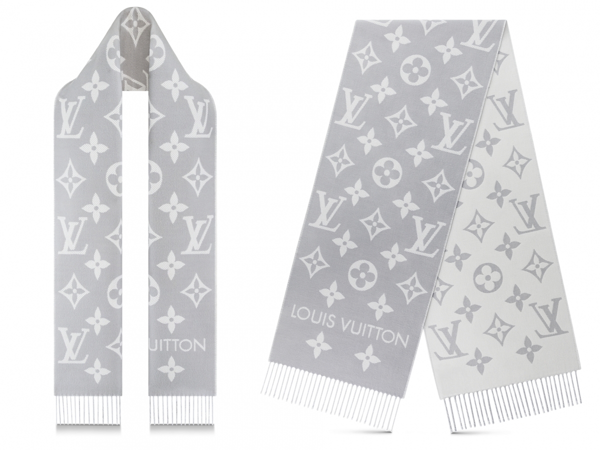 這款採用溫暖的羊毛編織而成,質感柔軟,並以標誌性的 Monogram 圖案為主,加上深淺灰色調配搭,超時尚百搭!下方亦有「 Louis Vuitton」標誌和流蘇飾邊,日常休閒穿搭也很易襯!