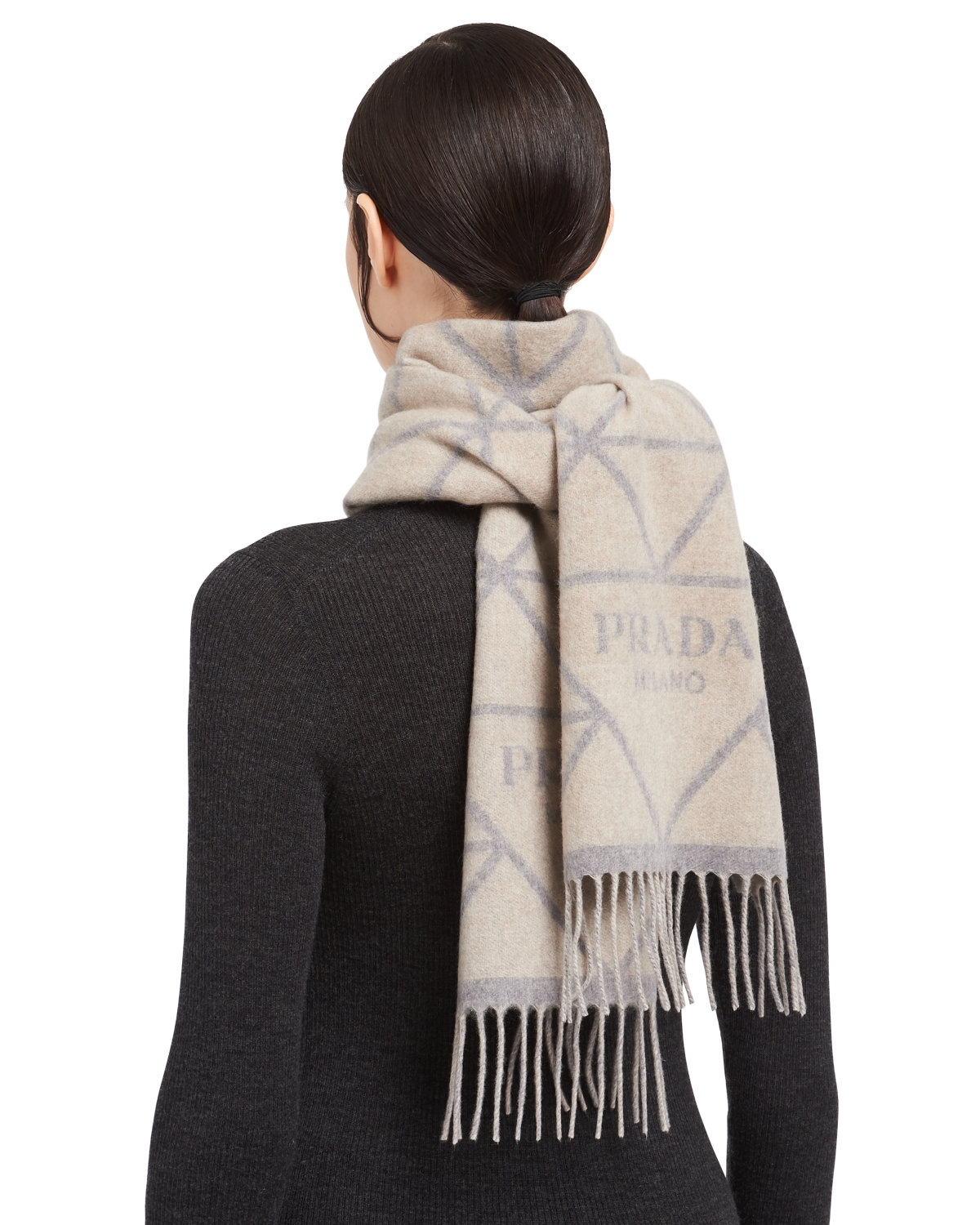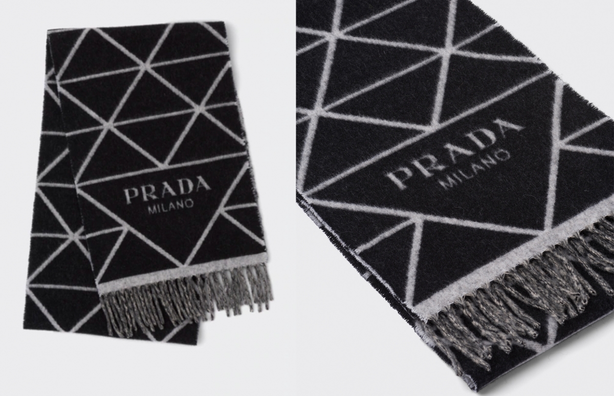 Prada的頸巾同樣是值得考慮入手的款式,柔軟的茄士咩羊絨質地,加上雙面和流蘇飾邊設計,再把Prada經典印字標誌化成織花細節,結合成三角形幾何織花圖案,十分搶眼又不失品牌特色!