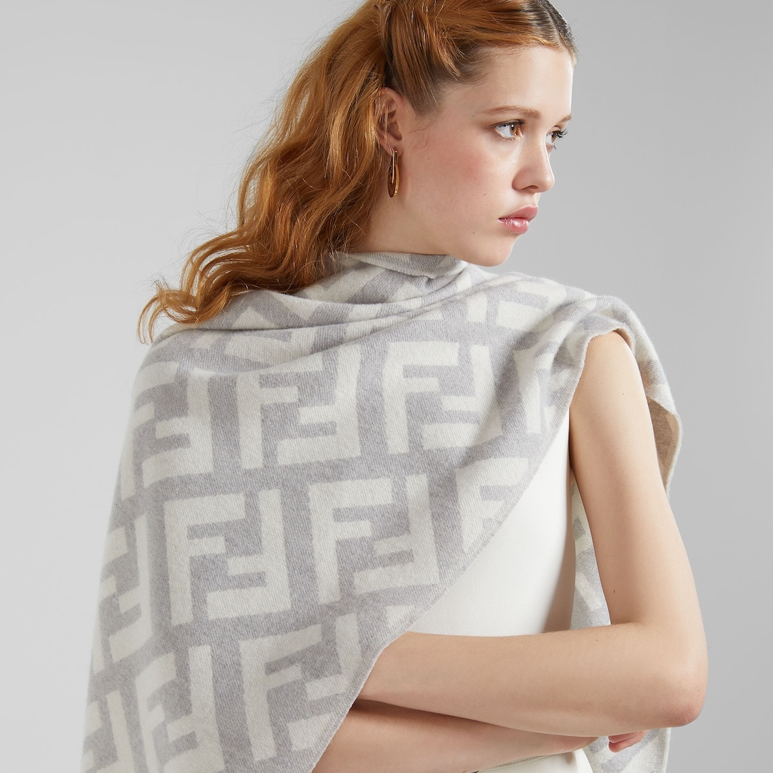 長圍巾以白色羊絨製成,使用lurex線編織而成的緹花營造出對比色的經典滿版FF圖案,尾端有流蘇裝飾,除了白色還有其他3隻配色可選擇,每一款都散發出溫柔感~