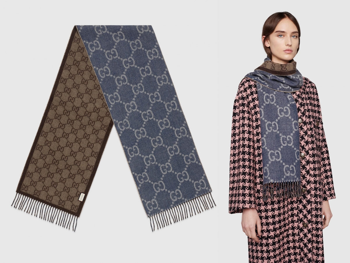 另外還有一款雙面提花羊毛圍巾,看上去像復古牛仔布的設計,海軍藍色與淺棕色對比更加鮮明,同樣綴以GG圖案,整體更添玩味和特別~