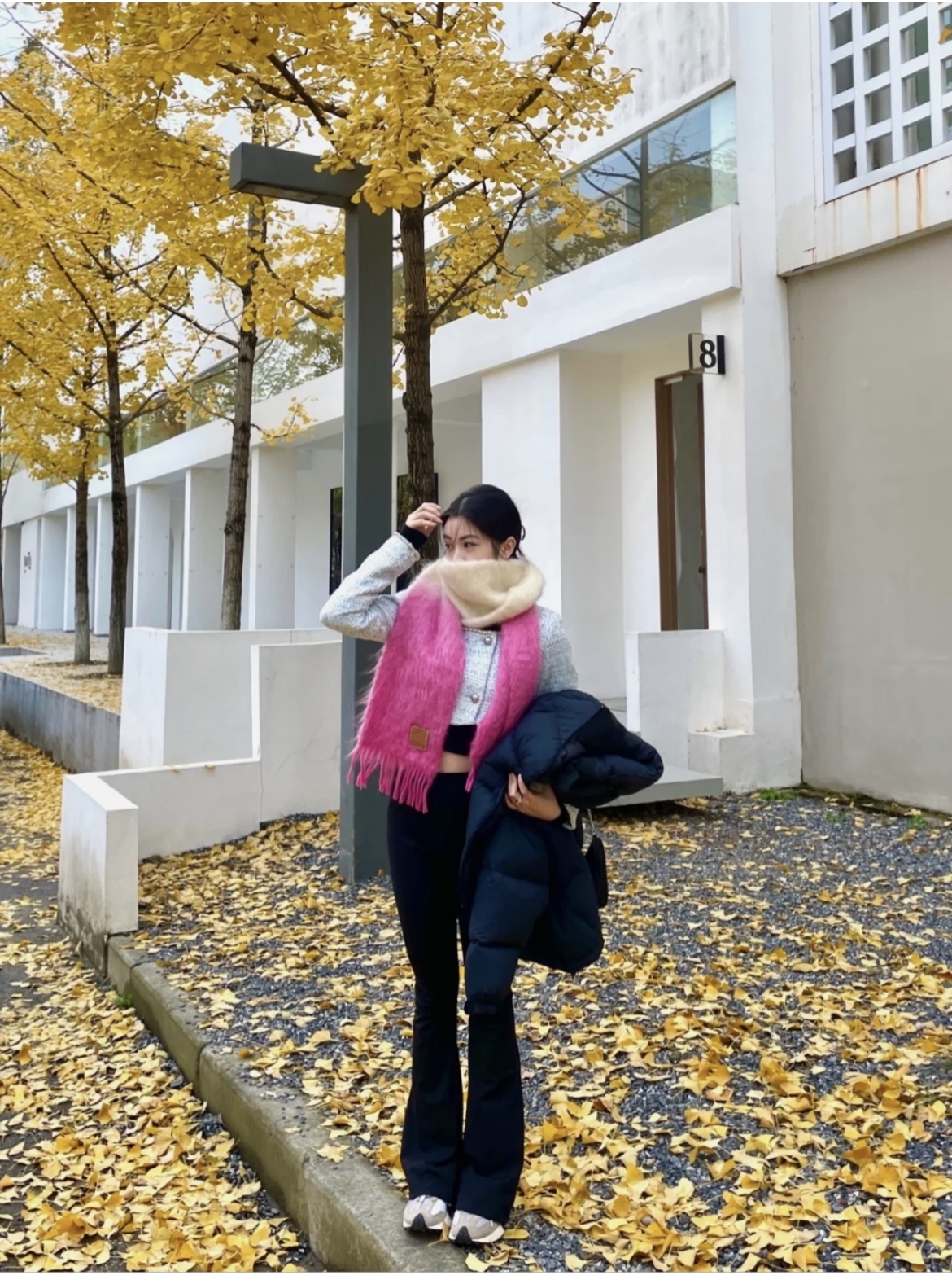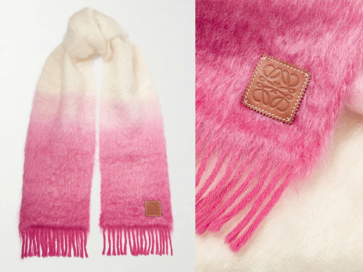 冬天除了沉穩的顏色,也可以搭配浪漫的粉紅色,這條粉紅、白色漸變的頸巾,充滿少女感~採用柔軟的馬海毛混紡面料製成,末端配上充滿質感的 LOEWE 皮革標籤,超有氣質,馬上為造型增添一點甜美!