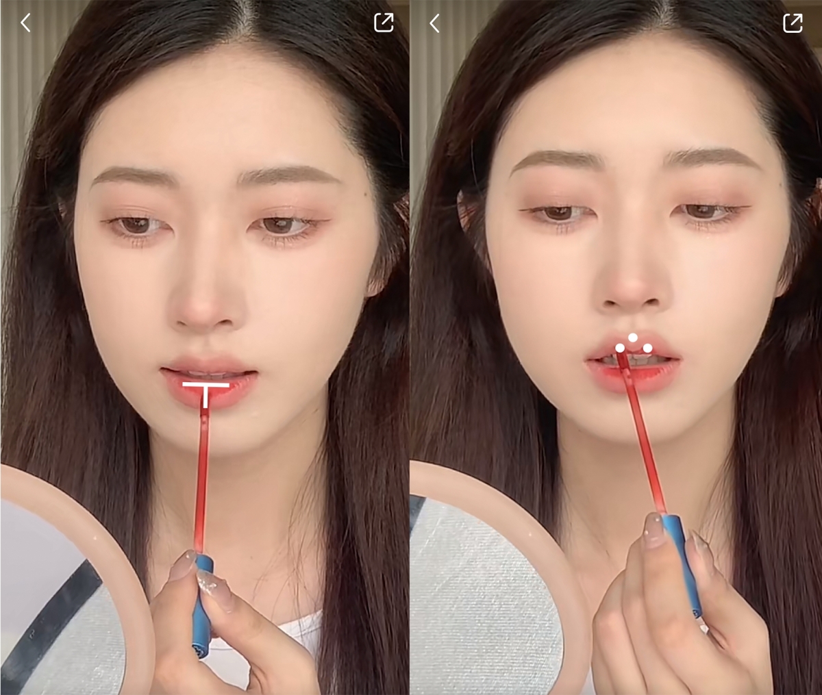 Step 3:再用深一度的唇釉疊加,先在下唇畫上一個「T」字,上唇則在唇珠附近點上三點。