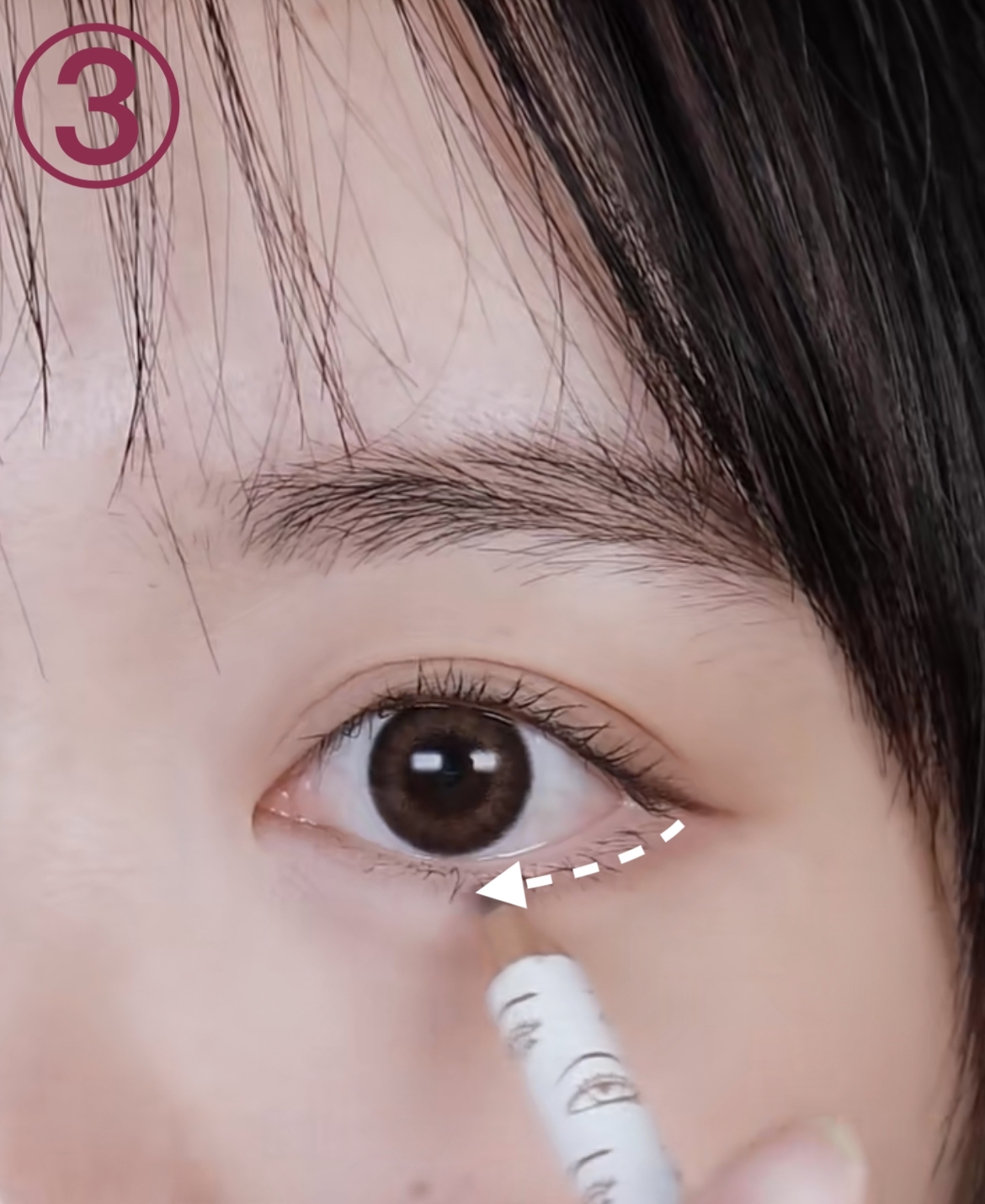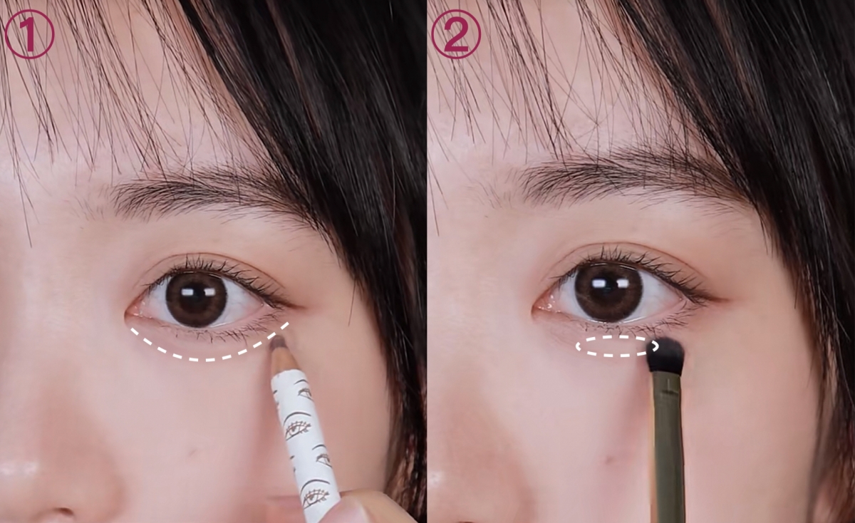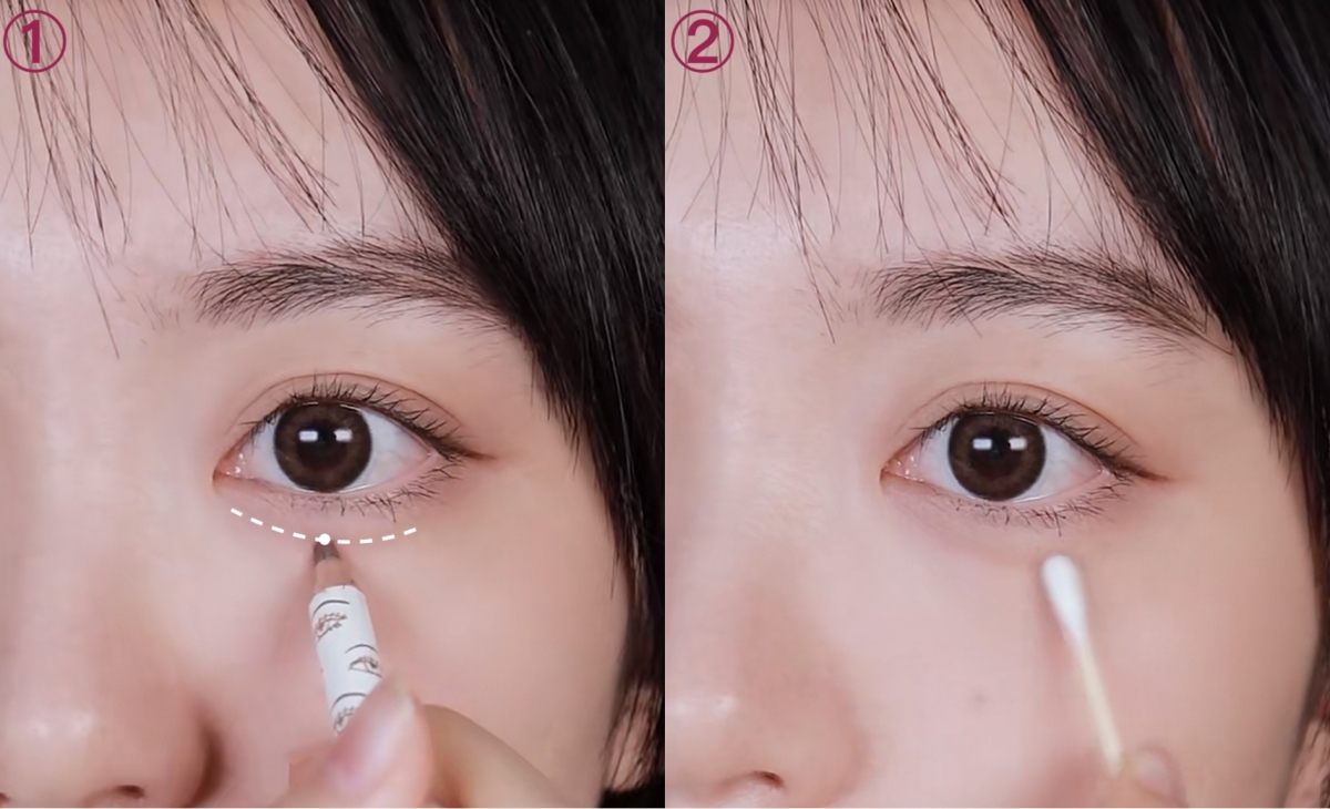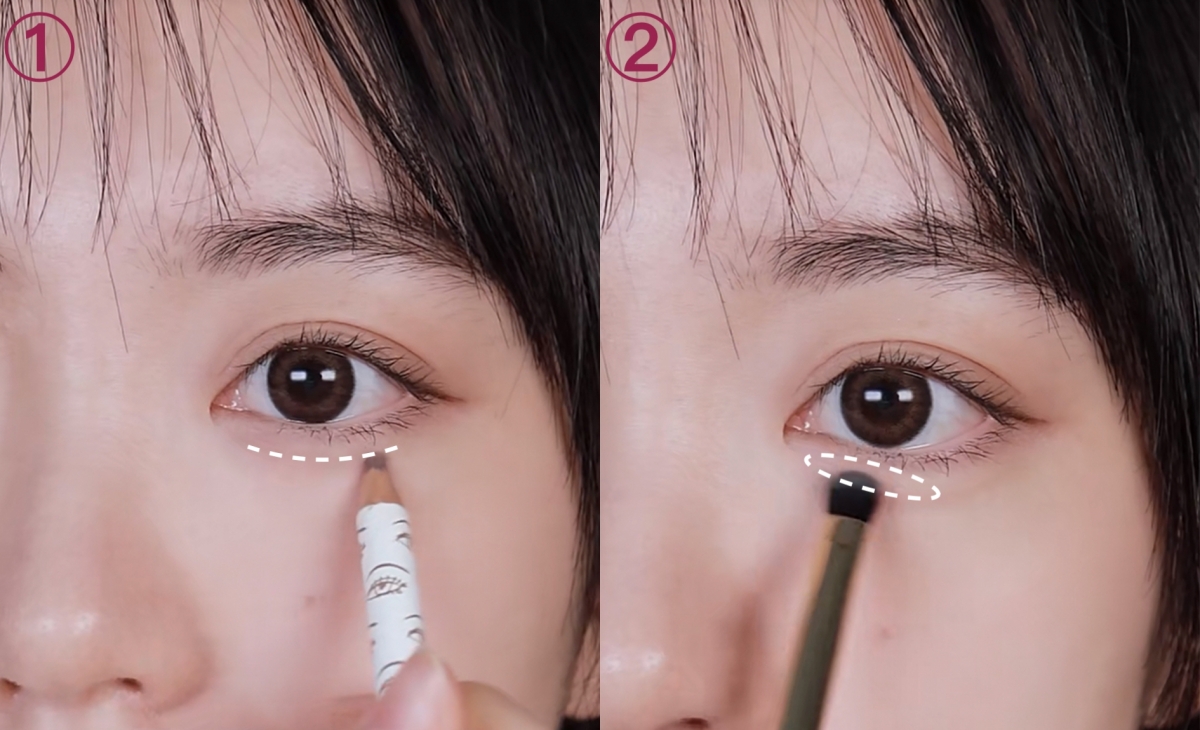 以眼球中間位為眼下定點,用臥蠶筆或陰影粉勾畫出一條臥蠶線,由眼頭至眼白 ½位置,稍微暈染一下,形成自然的臥蠶陰影。