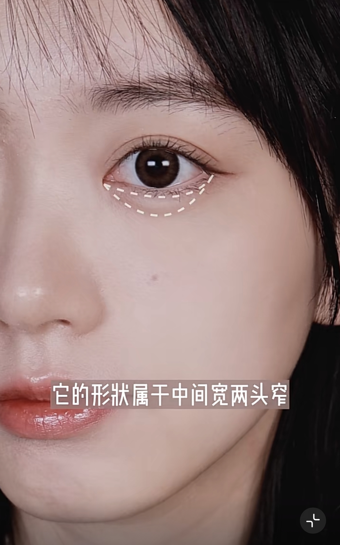 月牙臥蠶形狀會呈現成中間寬兩邊窄,把重點放在中間位置,這種畫法比較適合想縮短中庭或是眼睛較細長的女生。