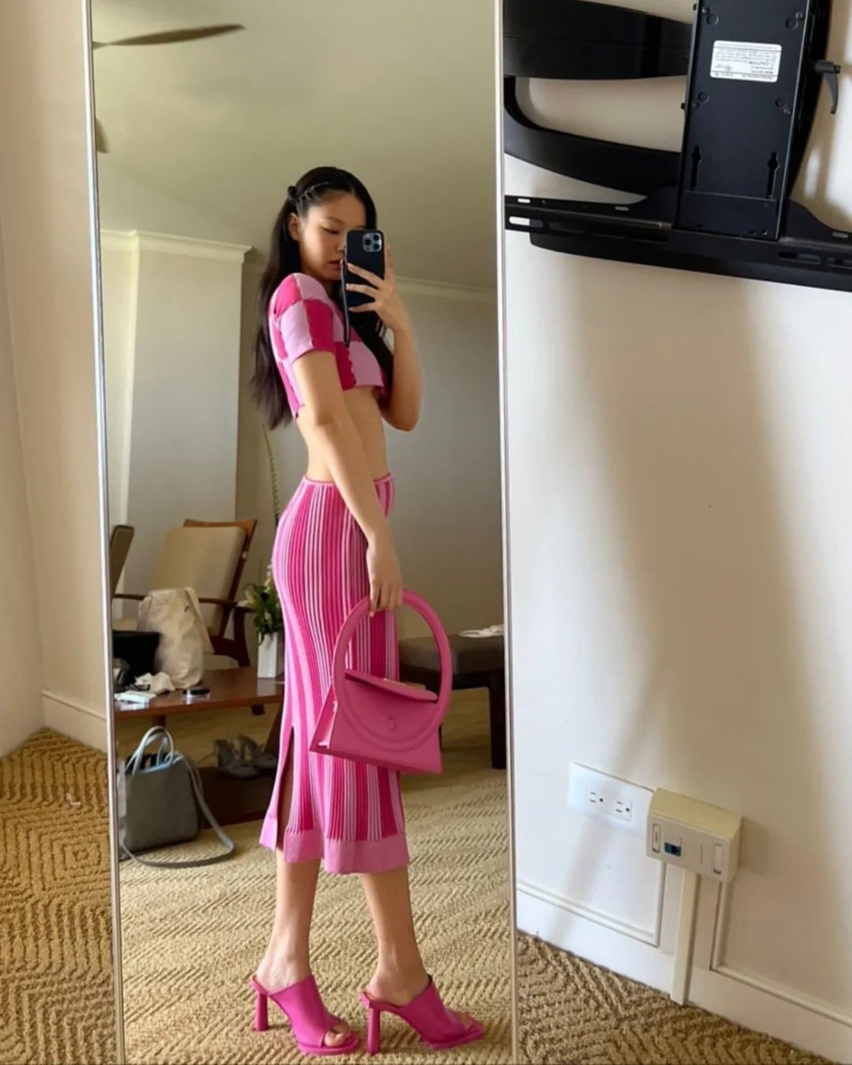 Jennie曾經受邀出席在夏威夷舉行的時裝騷,她在IG上傳了自己當日的破格服裝,可見她身穿一件粉紅色的短版上衣及條紋長裙,她擺出姿勢拍照時,令到下胸的曲線若隱若現。其實在歐美明星之中這樣的衣著很平常,但對於韓國偶像來說算是很大尺度。