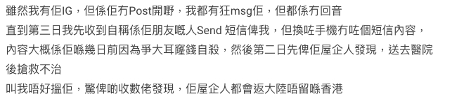 起初女生覺得新男友很尊重她,而且顏值很高,因此對這段感情也非常認真。女樓主卻沒想到,只是拍拖三個月後,就連熱戀期都還沒過,就收到一個噩耗,男友已經因為欠債而自殺,送院不治。她表示當時男友已經失去聯絡整整兩天,直到第三天男方的好友才發了一個短訊通知她,男友已經去世了。還叫她千萬不要去男友的家等,因為害怕「收數佬」會發現她。
