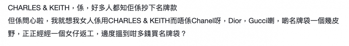 近日有一名港男在連登上以「講真 真係好羨慕啲男人有個用CHARLES & KEITH嘅女朋友」為題,指自己很想找一個願意用小CK而不是Dior等更貴名牌手袋的女友:「啲名牌袋一個幾皮野,正正經經一個女仔返工,邊度搵到咁多錢買名牌袋?」他更指責很多女生為了名牌手袋,出賣身體等,換取對方送一個名牌手袋:「唔好同我講靚女自然會有人送,男人送得一定有企圖」