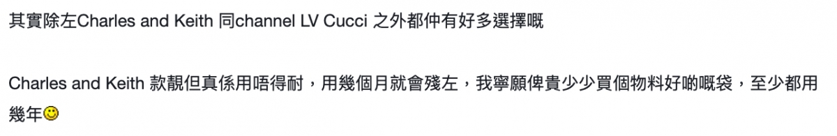 也有網民指出,為什麼用名牌手袋就代表拜金,有很多人用名牌袋是因為質量好、款式好看:「而且小CK都平唔到去邊,要平不如用無印麻布袋?」直言小CK的質量對比其他更貴的名牌,可能較為不耐用,加上款式又常被說與其他名牌類同,因此寧願買一個好的,可以用更久。