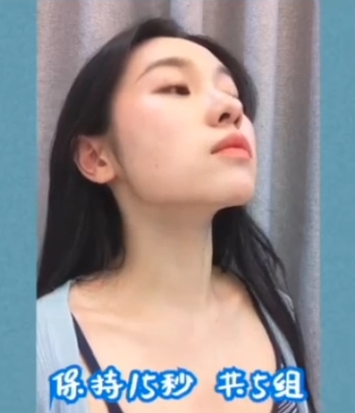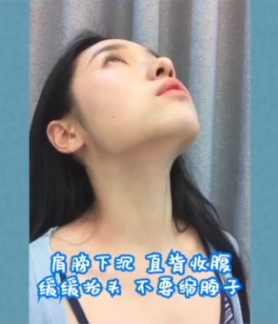 第一個動作:先把舌頭頂住上顎、肩膀下沉,而頸部延伸到耳後的力量都是保持向上,最大限度地拉伸肩頸。每次保持15秒,重複做5組。