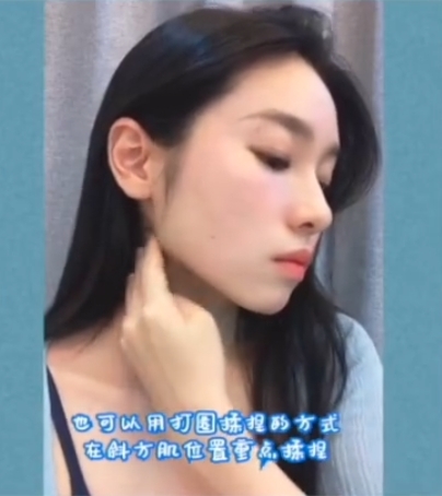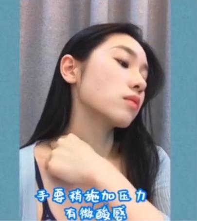 第二個動作:利用指腹從頸部至肩膀位置向下推,手指要稍微施加壓力,有微酸感為佳。也可以用打圈揉捏的方式在斜方肌位置重點揉捏。20次為1組,重複做2組。