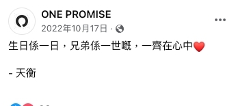 加上文廸、天衡、Sora三人是在中學認識,早就在不少訪問中說過,當時就已經認定了對方就是音樂路上的好拍檔。他們不止一次提到四名團員的理念相當一致,默契也非常好,可以說是一起成長,一起走過默默無名的時代。如今ONE PROMISE開始有名才宣布解散,令很多人表示不解,加上近月天衡才在FB上慶祝生日:「生日係一日,兄弟係一世嘅,一齊在心中」兄弟感情非常要好!