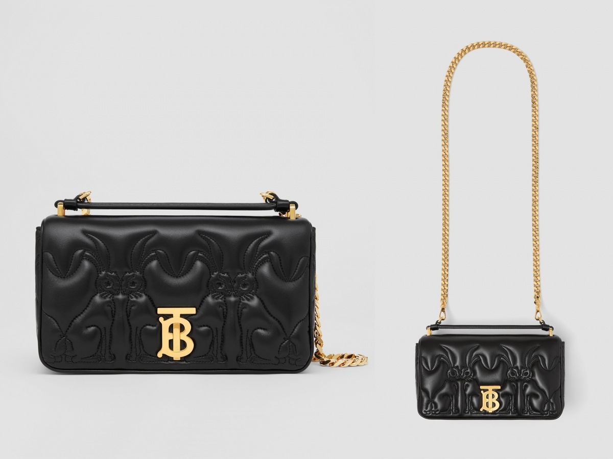 利用黑線絎縫方式將可愛的兔仔圖案融入在黑色Lola Bag的袋身,仔細看便會發現是一對正在對視的兔子,並飾有金色TB Logo,配上金色的金屬鍊帶,可以轉換成多種揹法,低調又不失高貴感!