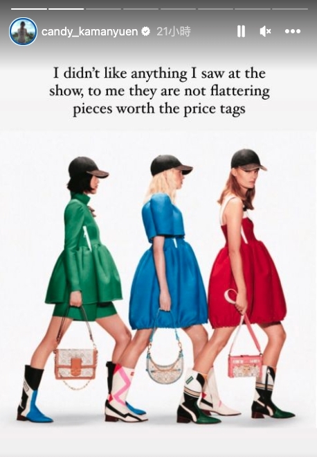 於是袁嘉敏日前就在IG連續上傳限時動態反擊,她先是承認自己討厭LV「我在之前的影片中已經說過,我討厭 LV,不喜歡Hermès(除了他們的家居用品)」她解釋自己會出席LV活動是個巧合,當時與朋友參加英皇珠寶的發布會,剛好對面的LV正在舉辦Cruise 22系列VIP秀,朋友要順便去LV所以就一起在那裡看表演。
