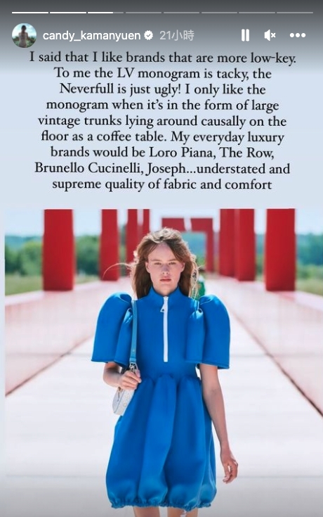 袁嘉敏又在IG解釋自己討厭LV的原因「對我來說LV的花押字很俗氣,Neverfull 很醜! 」甚至大方分享自己喜愛的品牌是 Loro Piana、The Row及Brunello Cucinelli等。
