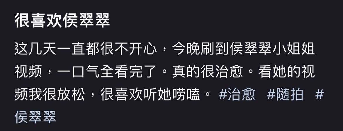 侯翠翠這樣真實自然的生活態度讓她在網上爆紅,在半年內就累積了百萬粉絲!許多粉絲看完侯翠翠的影片之後就表示:治愈了生活上的焦慮啊~