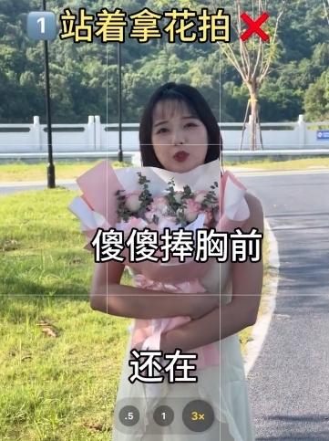 女生收到花的時候,通常都只會將花束捧在胸前拍照,但其實一點新意都沒有。大家可以叫朋友或另一半後退幾步,再用手機放大3倍拍照,可以微微斜抱花束,手臂呈直角,記得要用力收緊下巴。